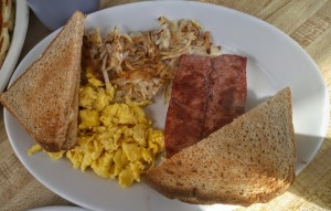 My yummy breakfast: Eggs, Kielbasa, Hash browns and Toast